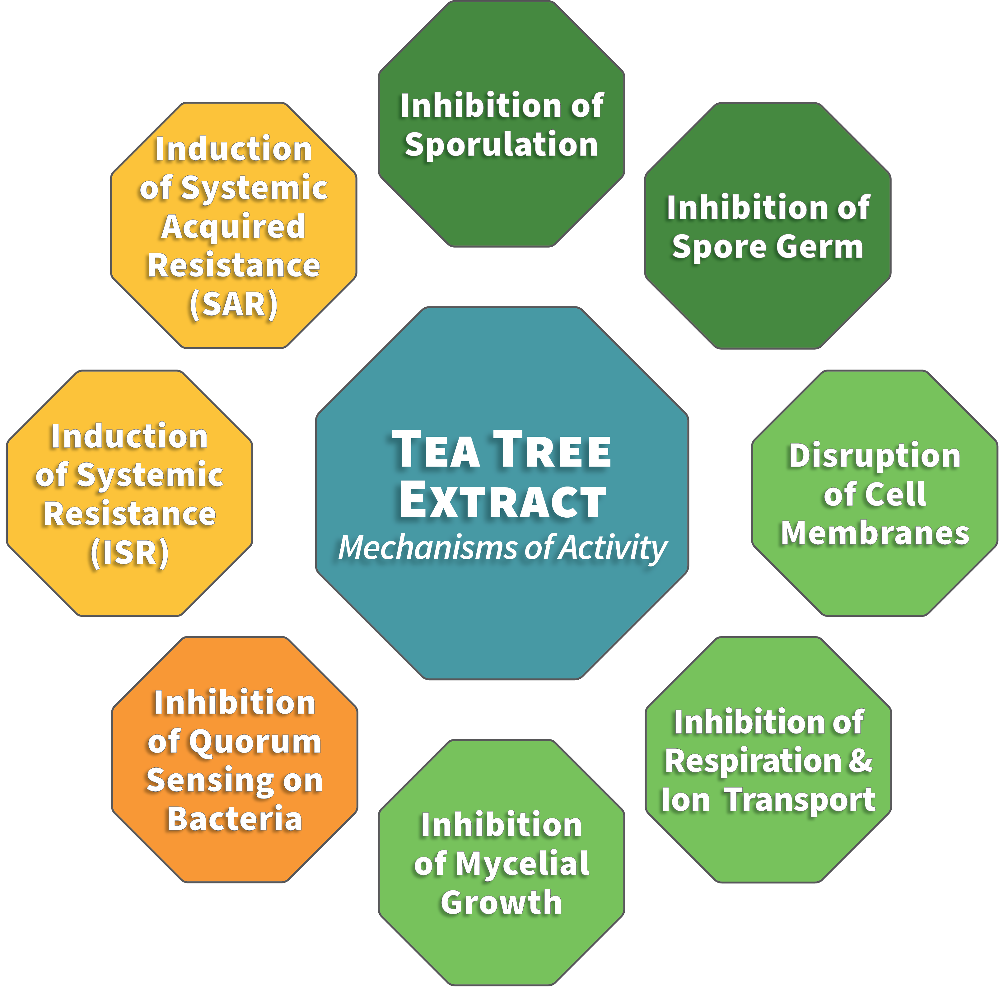 The extract of the tea tree plant provides a unique set of terpenes with eight powerful mechanisms of activity. These enable REGEV HBX to disrupt cell membranes while inhibiting sporulation, spore germination, respiration, ion transport and mycelial growth. Plus, unlike most other fungicides, the tea tree extract in REGEV HBX also battles bacterial pathogens by disrupting cell membranes and inhibiting the infection process. Together, these mechanisms deliver the disease protection trifecta of preventive, anti-sporulant and curative disease control. The inclusion of difenoconazole adds a ninth mechanism, which reinforces the tea tree extract by inhibiting fungal ergosterol biosynthesis, endowing REGEV HBX with double kick-back curative control.